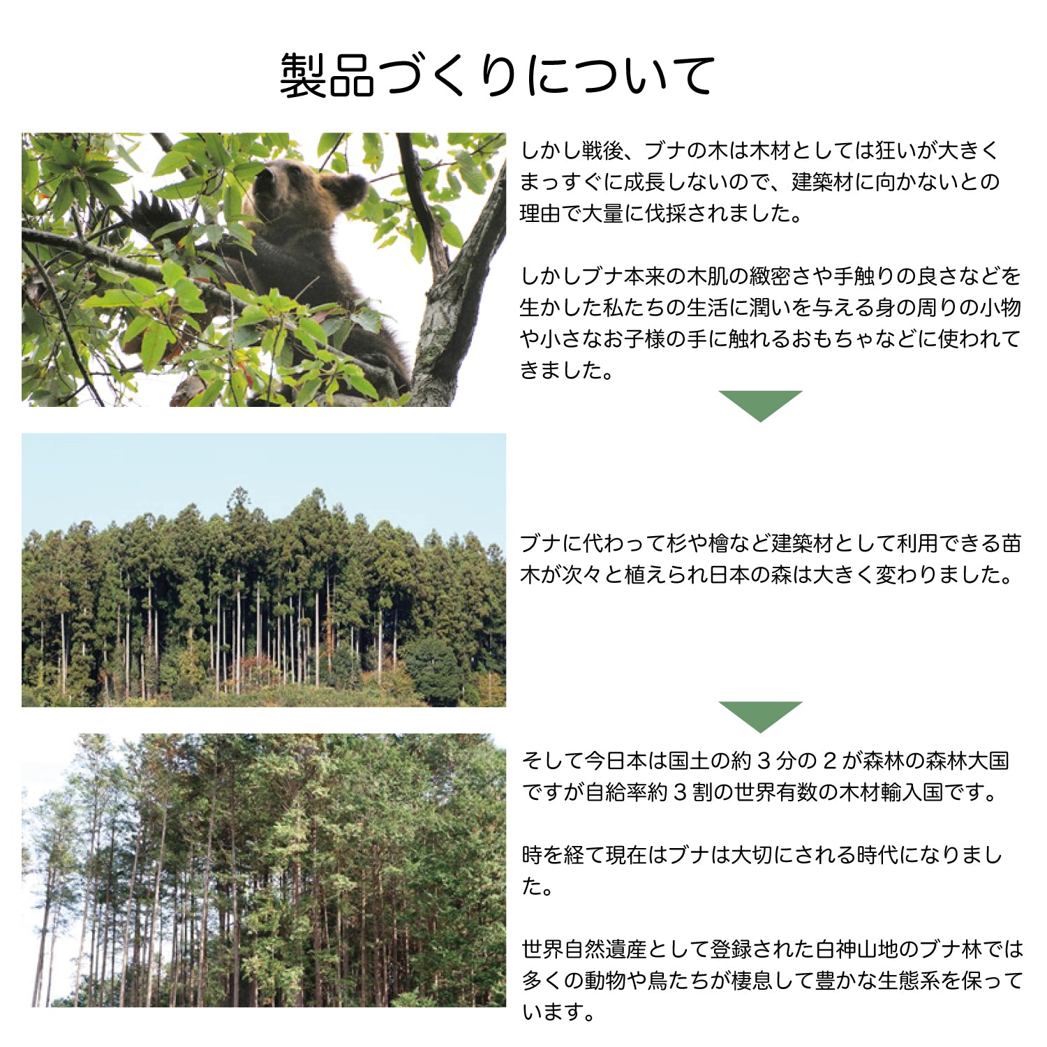 私たちは、素材としてぶなの木を中心に、流行に関係なくお子様により安全性と知育性の高い『木のおもちゃ』を一つひとつていねいに作り続けて行きたいと思っています。