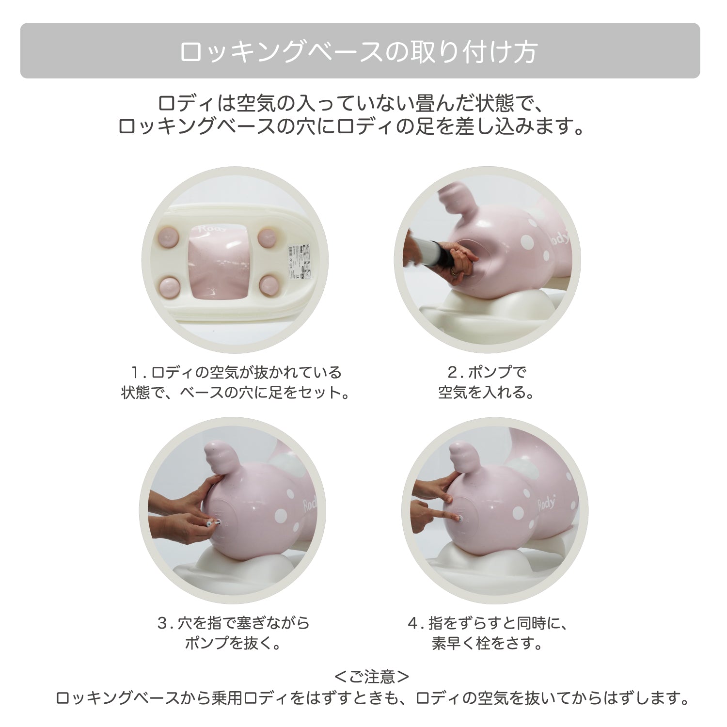 ※付属品を付けてご使用の際は、一度乗用ロディの空気を少し抜いていただき、ロディの足を付属品に設置後、改めて空気入を入れていただくことでご使用いただけます。